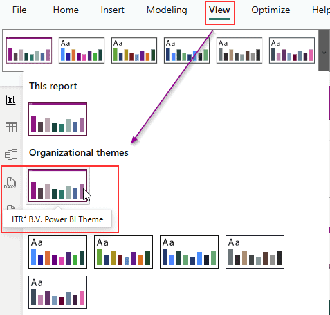 Gebruikers vinden de beschikbare thema’s in Power BI Desktop via het tabblad Beeld (View). Klik op Thema’s, en kies onder het kopje Organisatorisch het juiste thema. Deze thema’s zijn alleen beschikbaar als een beheerder ze heeft toegevoegd via het adminportaal.